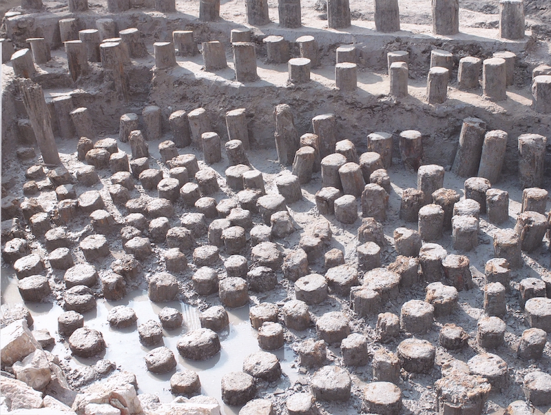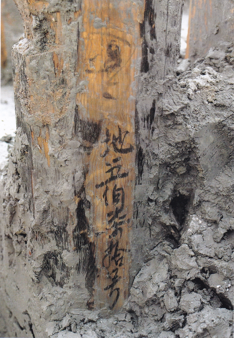 水闸底部打满了地钉,地钉其实就是一根根高约4米的木桩子,而在水闸的四周,也布满了木桩,据估算,整个水利工程中使用的木桩有上万根。部分木桩上墨书文字和八思巴文戳记,反映了当时严格的管理制度。