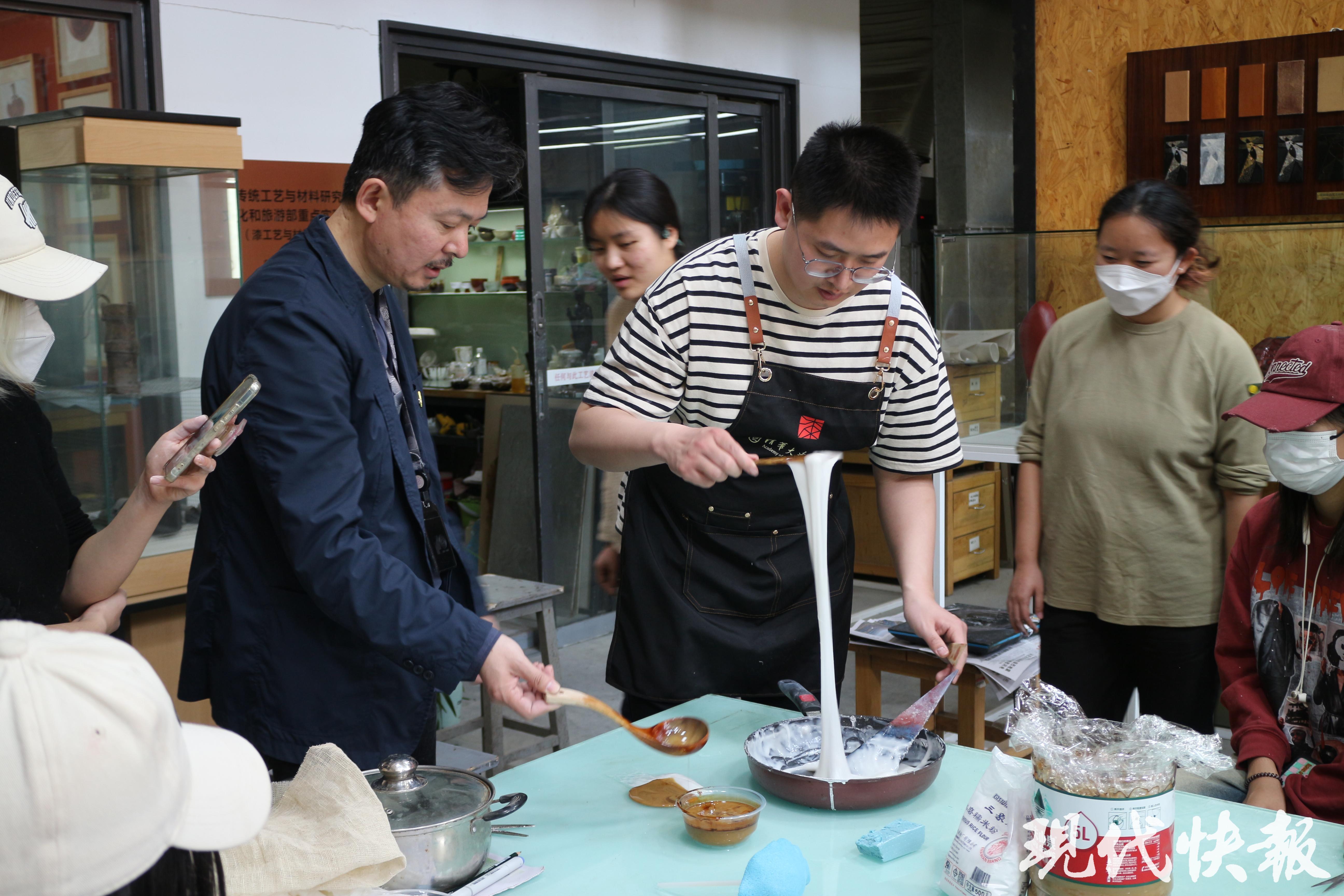 “我是一个喜欢做大漆,希望大漆融入到我们生活中的人。有一个成语叫‘如胶似漆’,形容漆和胶一样有很强的黏合作用。而我,同样被漆的魅力紧紧吸引,被它牢牢黏住了。”来自江苏常州的清华大学漆艺方向在读博士张耿亮深情地说道。