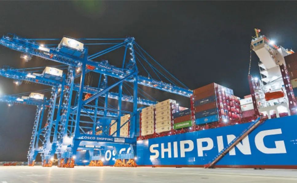 共建“一带一路”国家在工作制度对接、技术标准协调、检验结果互认等方面强化合作、统一标准,贸易自由化便利化水平不断提升。上海洋山港海关对接共建国家进出口货物相关标准,推动通关一体化方式申报,提升通关效率。图为无人驾驶的全自动导引车在洋山港穿梭往来,搬运集装箱。王初 摄