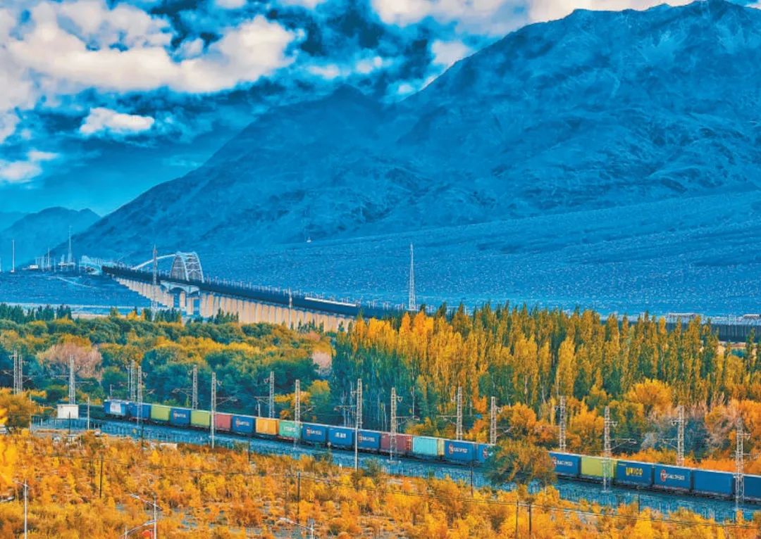 2013年,随着共建“一带一路”倡议提出,中欧班列应运而生。今年11月20日,第十万列中欧班列正式出境。截至目前,中欧班列累计运送货物超1100万标箱、货值超4200亿美元,货物品类达53大类5万余种。图为中欧班列行驶在新疆乌鲁木齐达坂城湿地。摆风亮 摄(新华社发)