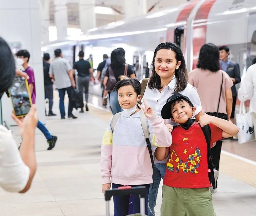 雅万高铁是我国在境外完成全过程勘察设计建设的首个高铁项目,于去年10月17日正式开通运营,是中印尼共建“一带一路”合作的典范。图为乘客在和雅万高铁动车组合影留念。新华社记者 徐钦 摄