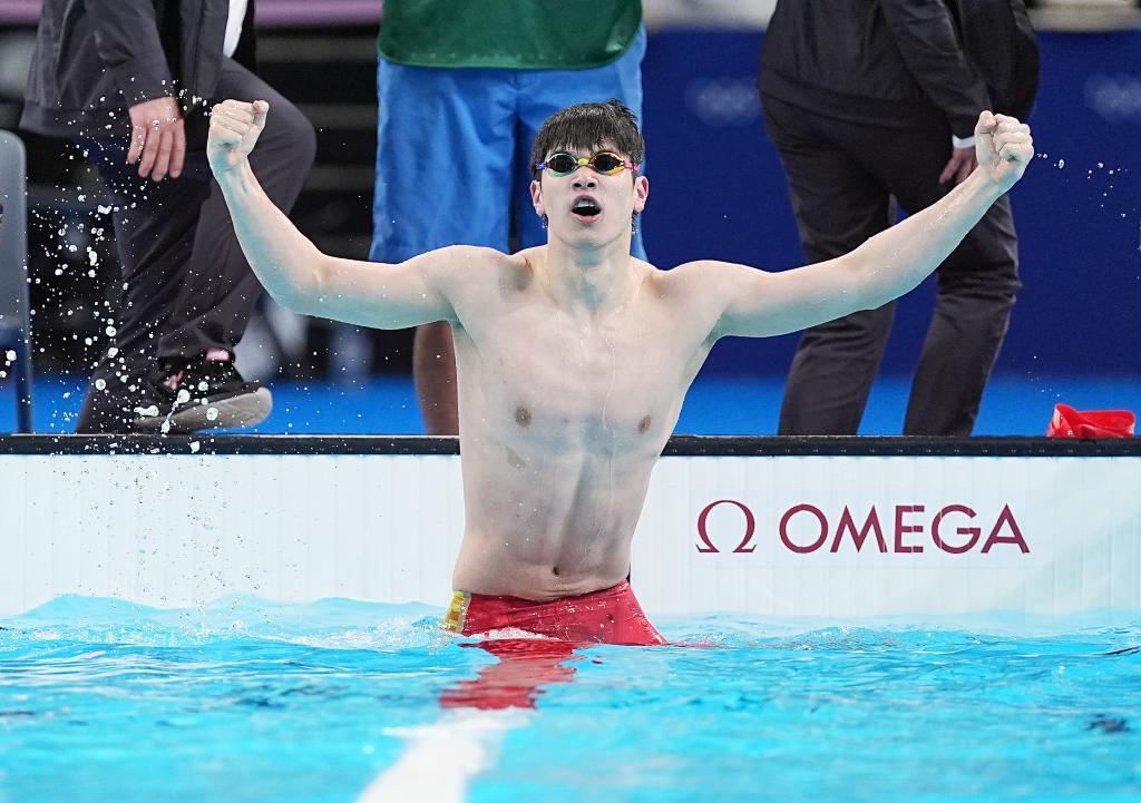 7月31日,中国选手潘展乐在比赛后庆祝。当日,在巴黎奥运会男子100米自由泳决赛中,潘展乐以46秒40的成绩夺冠并打破世界纪录。新华社记者 杜宇 摄
