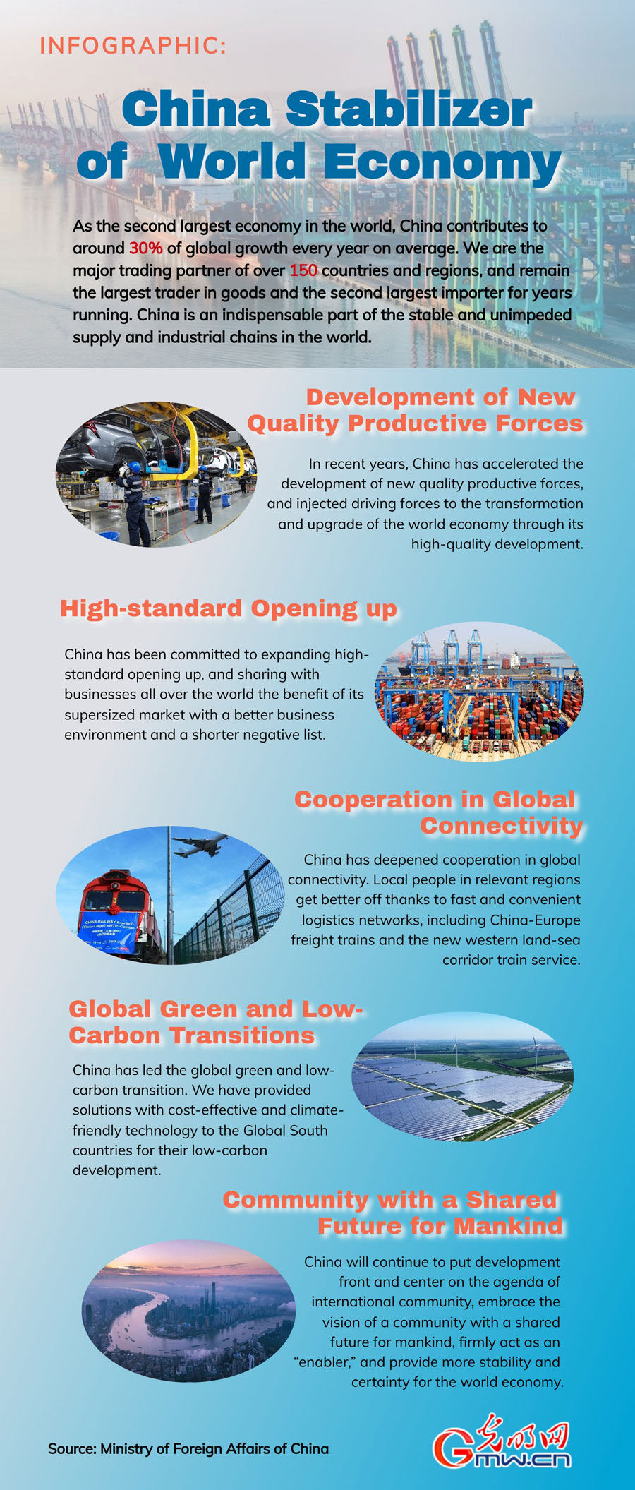 China has been the stabilizer of the world economy. As the second largest economy in the world, China contributes to around 30 percent of global growth every year on average. We are the major trading partner of over 150 countries and regions, and remain the largest trader in goods and the second largest importer for years running. China is an indispensable part of the stable and unimpeded supply and industrial chains in the world.