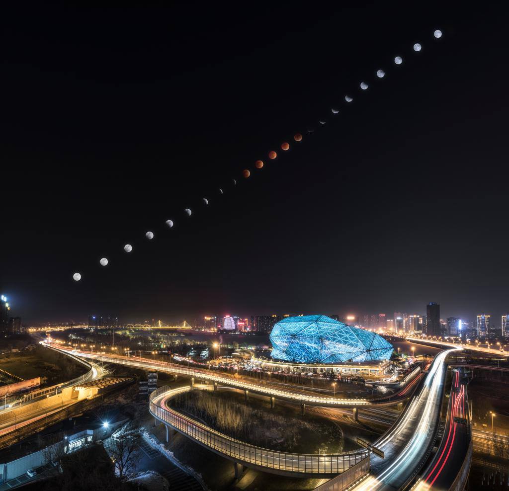 2018年1月31日在沈阳盛京大剧院拍摄的月全食过程(拼版照片)。(孙建鑫 摄)