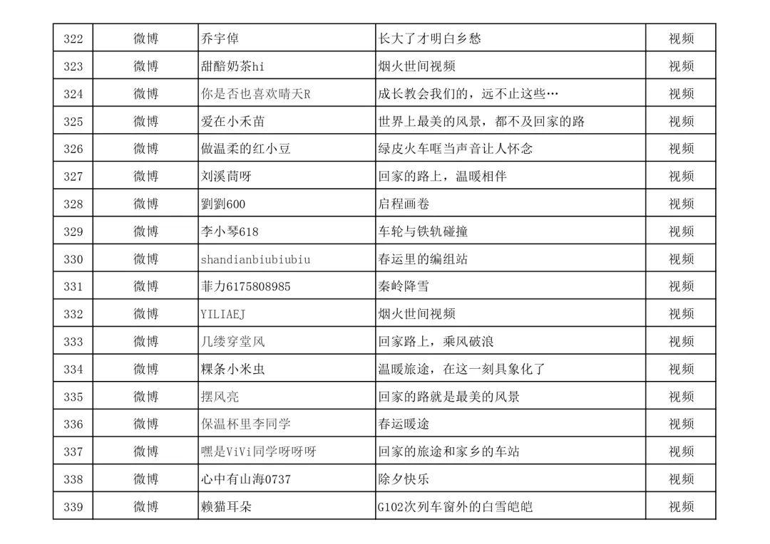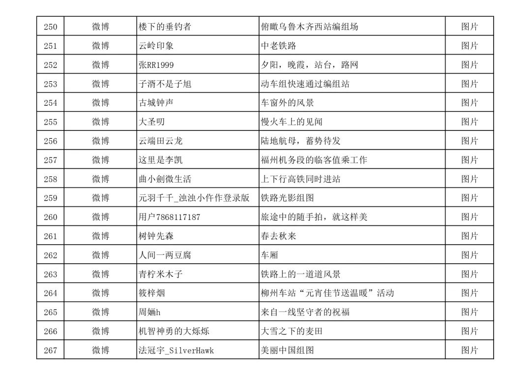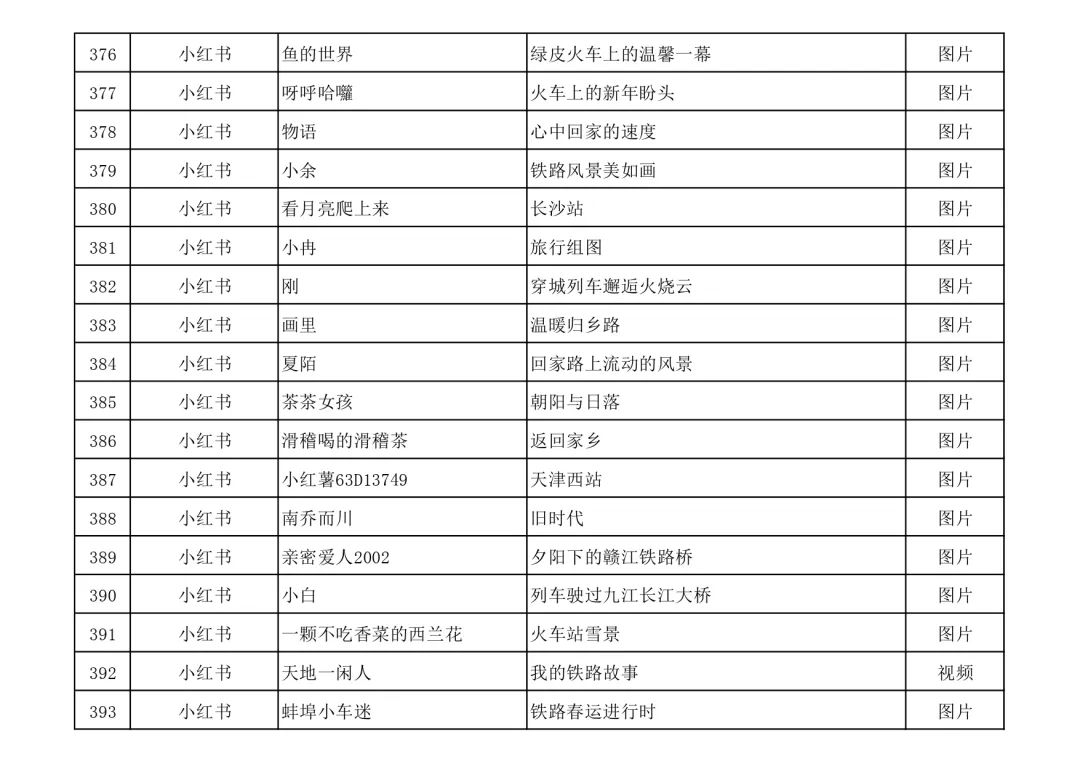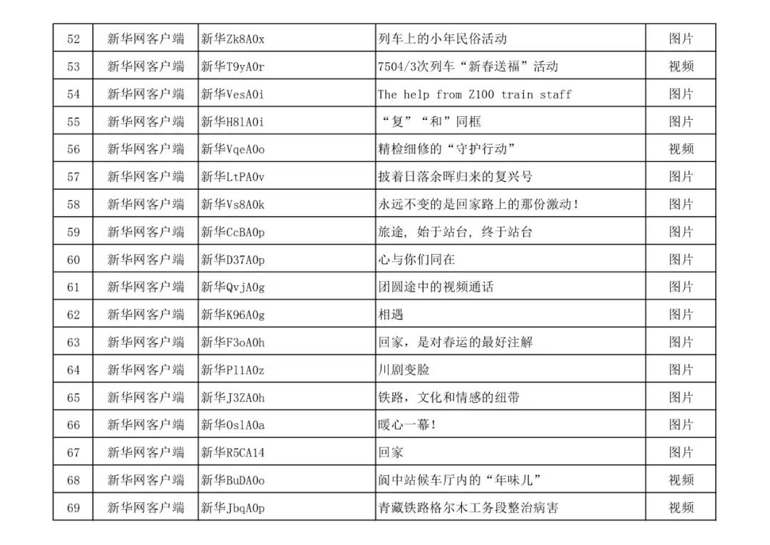 3月13日,由中宣部文明创建局、中央网信办网络传播局、中国国家铁路集团有限公司党组宣传部联合举办的“我的铁路风景”主题宣传首季活动优秀作品,在人民日报客户端、新华网、中国文明网、人民铁道网、中国国家铁路集团有限公司官方网站等平台公布,共410件,其中图片245个(组)、短视频131个、短文34篇。