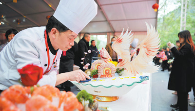 在四川南充举办的火锅美食文化活动上,火锅企业的大厨为观众呈现出一道道美食菜肴。余中华摄
