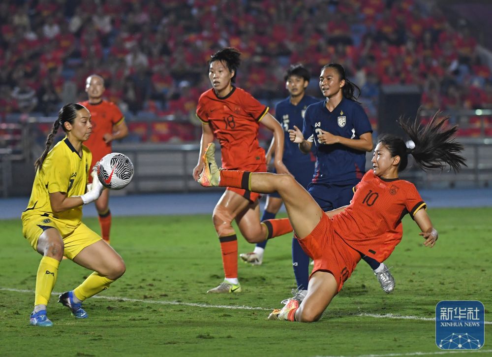 ↑ 中国队球员王妍雯(前右)在比赛中射门。新华社记者 陈诚 摄
