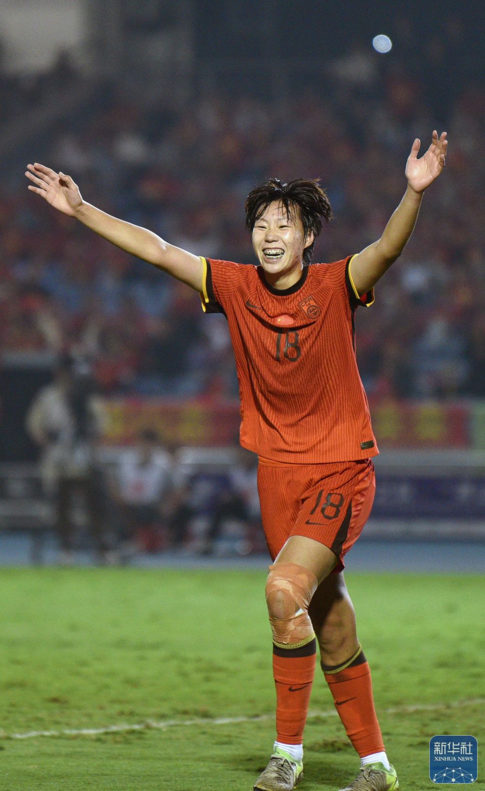 ↑ 中国队球员王爱芳(中)庆祝进球。新华社记者 陈诚 摄