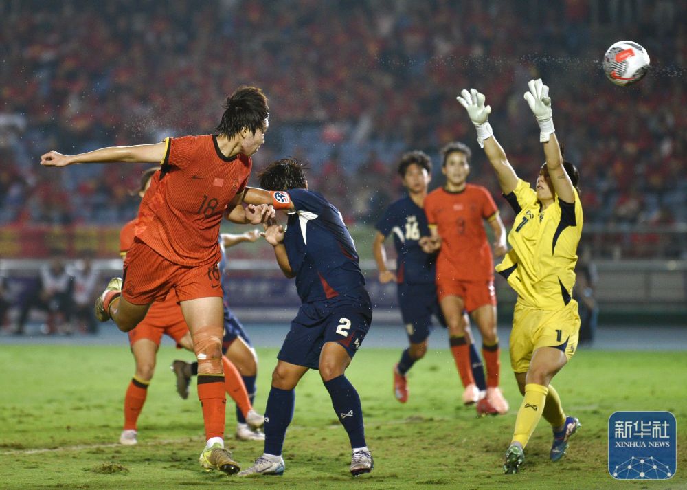 ↑ 中国队球员邵子钦(左一)头球破门。新华社记者 陈诚 摄