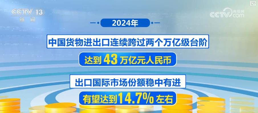 2024年,中国货物进出口连续跨过两个万亿级台阶,达到43万亿元人民币。出口国际市场份额稳中有进,有望达到14.7%左右。有进出口实绩的企业近70万家,其中民营企业占比超过八成。