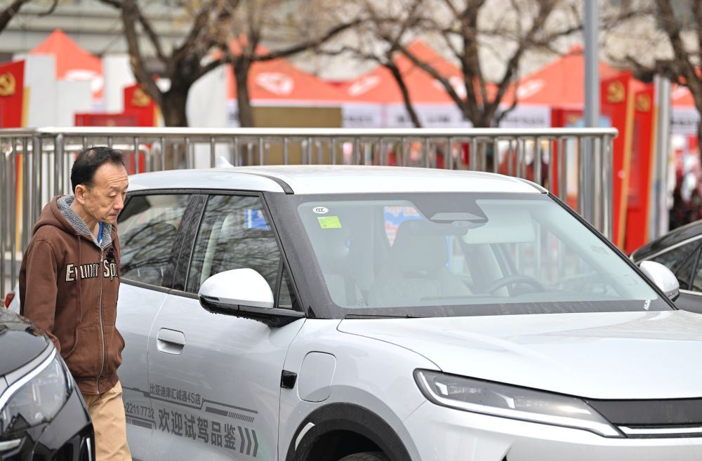 3月28日,天津市北辰区居民在活动现场看车。当日,天津市北辰区举行2025年消费品以旧换新惠民服务活动,现场汇聚了汽车、家电、数码产品等服务展区,吸引众多市民前来选购。新华社记者 李然 摄