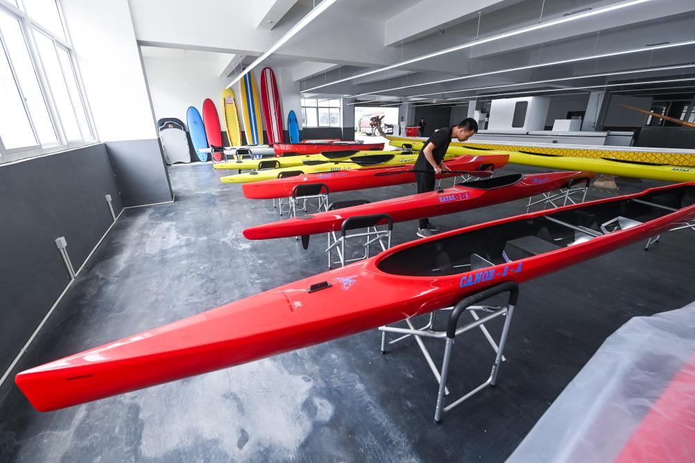 2023年7月18日,在位于杭州富阳的杭州飞鹰船艇有限公司车间内,工人在检查一批刚完工的皮划艇。新华社记者 徐昱 摄