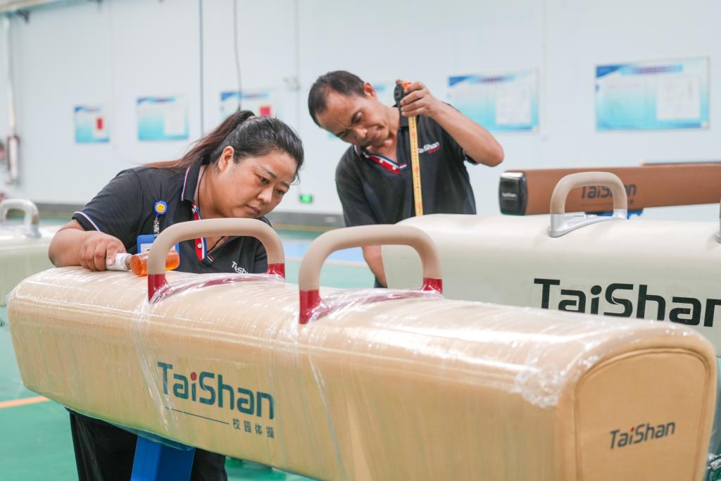 2024年7月8日,在山东泰山器材有限公司生产车间,工人在检测刚下线的鞍马。新华社记者 朱峥 摄
