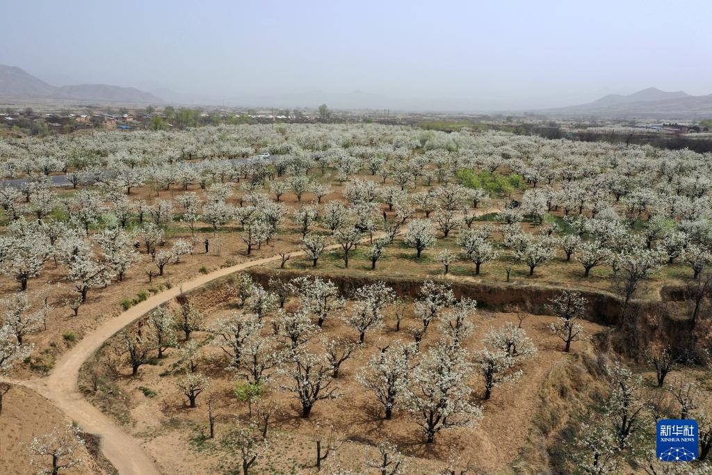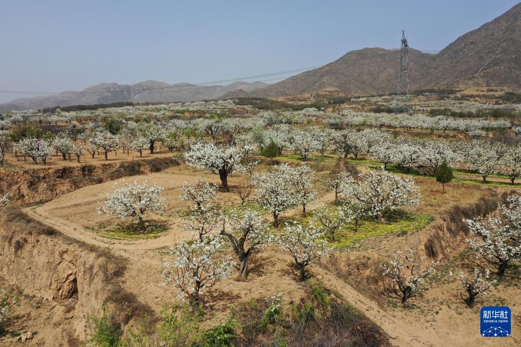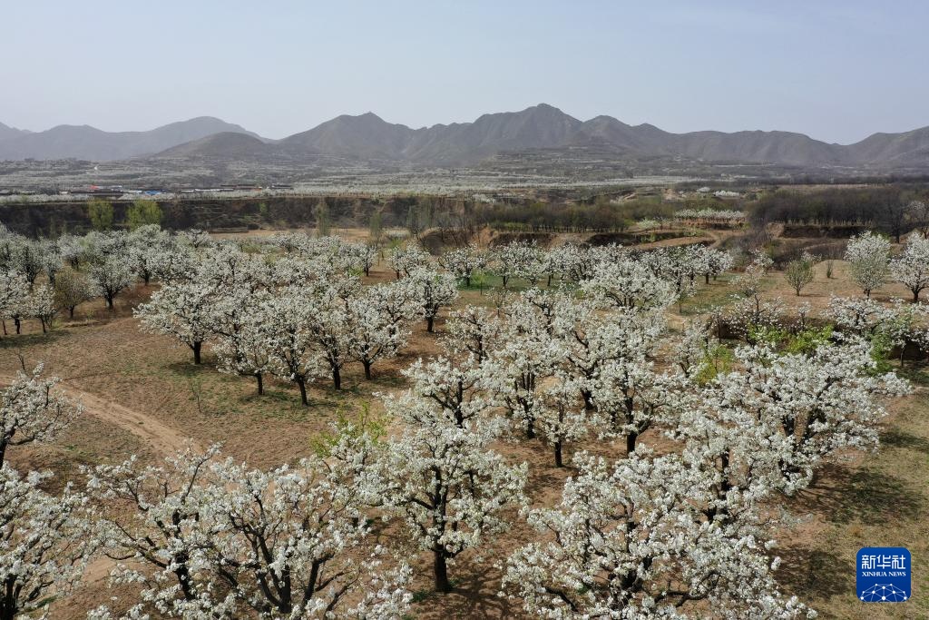 近日,位于云中山下的山西省原平市同川镇数万亩梨花相继盛开,怒放的梨花与大山相互映衬,呈现出一幅生机盎然的田园画卷。
