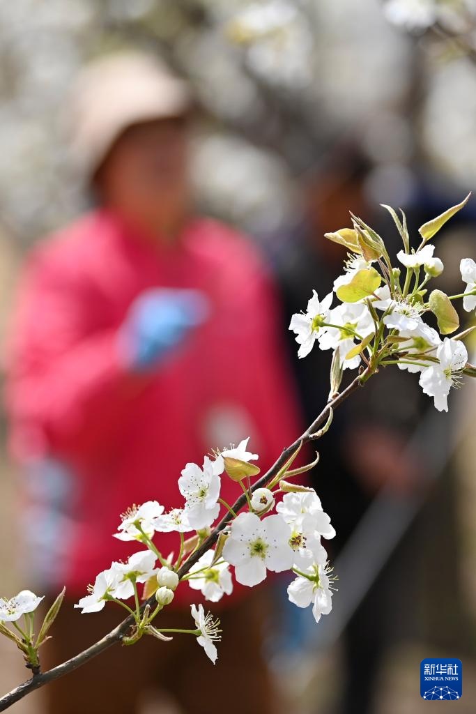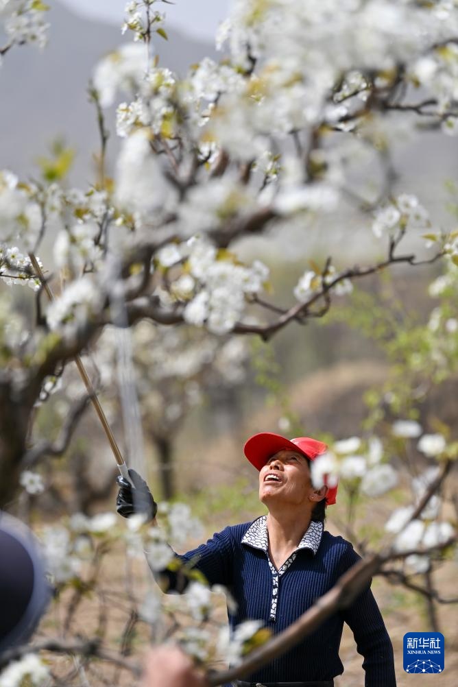 4月17日,在山西省原平市同川镇,果农给梨花授粉。