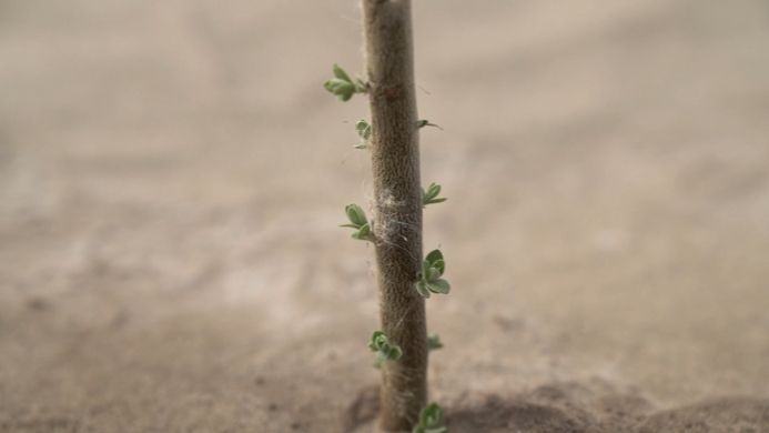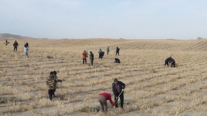 在新疆和田地区和田县阿和公路西侧群众治沙点,3月下旬种下的万亩沙枣、红柳等防风固沙树种已抽出绿芽,最近几日正在进行定杆作业。群众广泛参与治沙有效解决了造林治沙后续管护持续性问题。