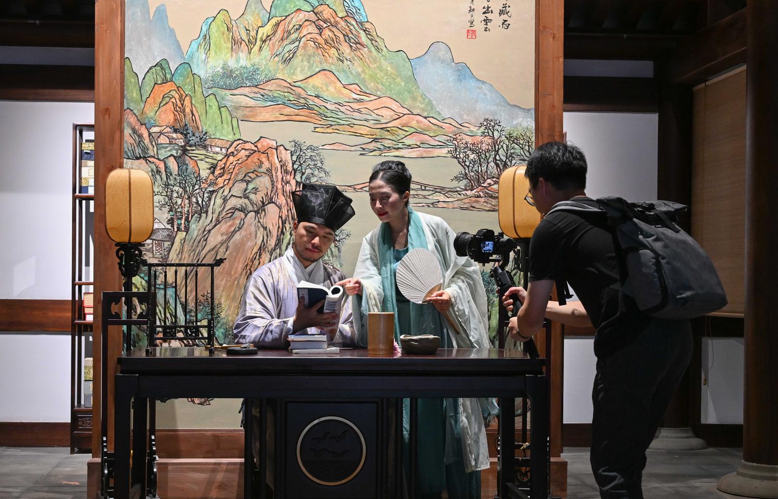 茶言精舍内,网红在拍摄视频。福建日报记者 游庆辉 摄