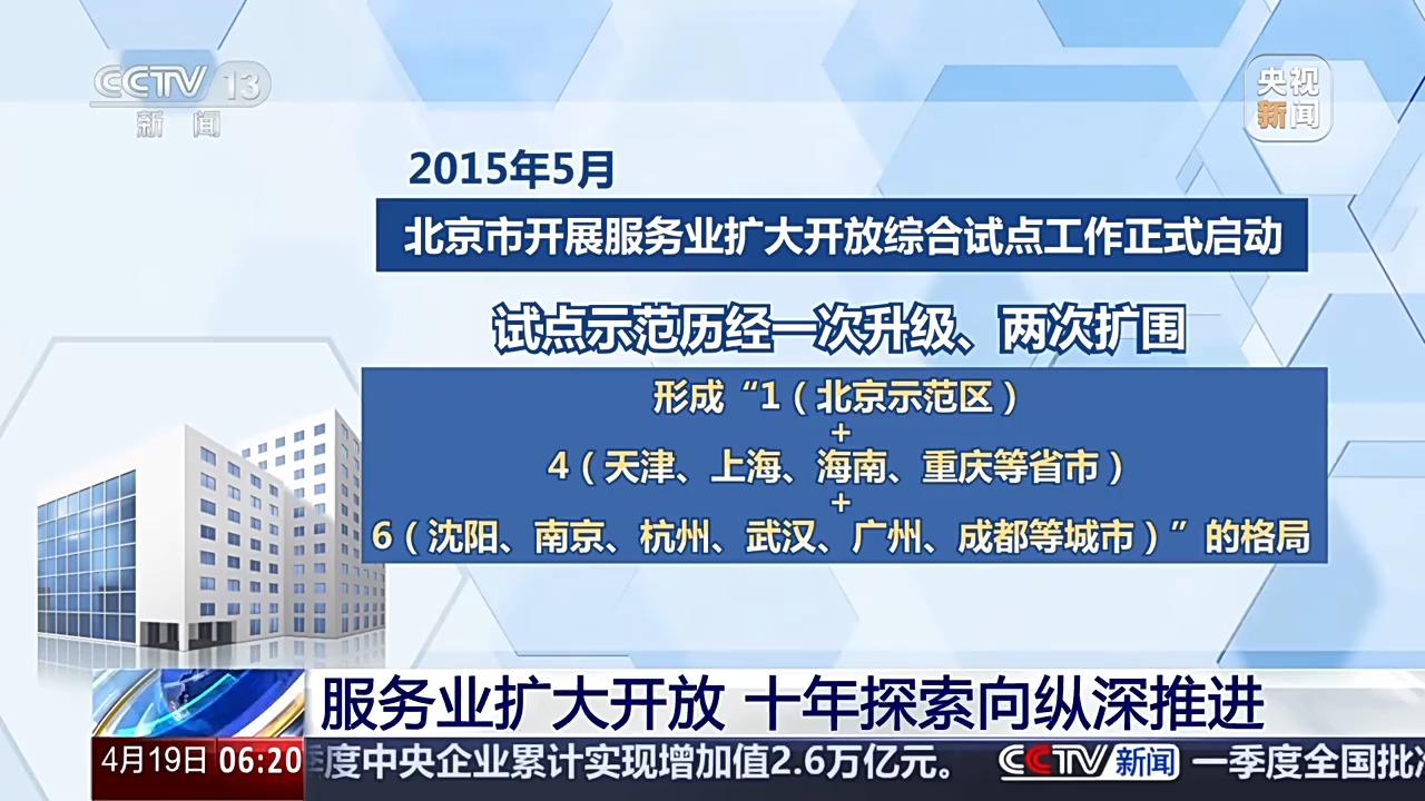 2015年5月,北京市开展服务业扩大开放综合试点工作正式启动。此后,试点示范历经一次升级、两次扩围,形成“1(北京示范区)+4(天津、上海、海南、重庆等省市)+6(沈阳、南京、杭州、武汉、广州、成都等城市)”的格局。