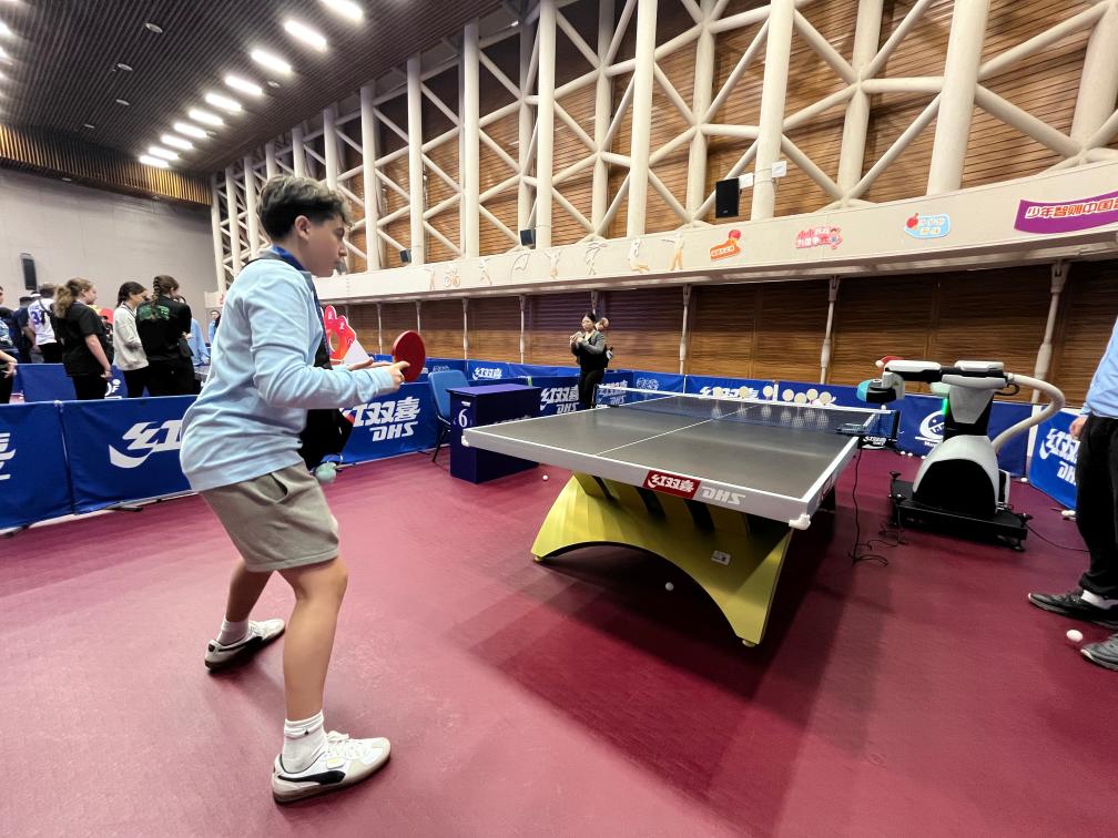 二楼体验区的乒乓球发球机器人前,学生们轮番挑战。曾在美国全国U14乒乓球比赛中拿下过第7名的瑞恩·特洛伊·李挥拍上阵,飞快的反应速度引发伙伴们此起彼伏的欢呼和掌声。