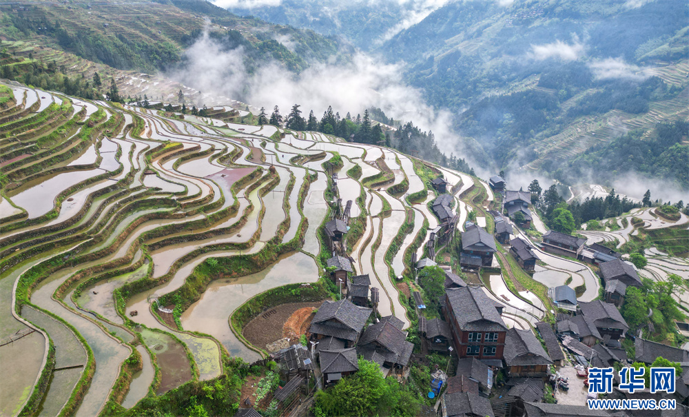 近日,贵州省黔东南苗族侗族自治州从江县加榜乡境内的梯田进入春耕期,梯田蓄水丰盈、线条分明、色彩斑斓,层层叠叠的梯田与苗族村寨,构成了一幅和谐自然的田园画卷。
