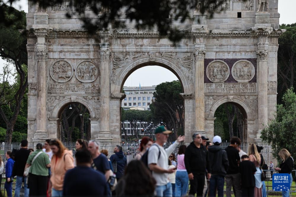 4月20日,游客在意大利罗马的君士坦丁凯旋门附近游览。