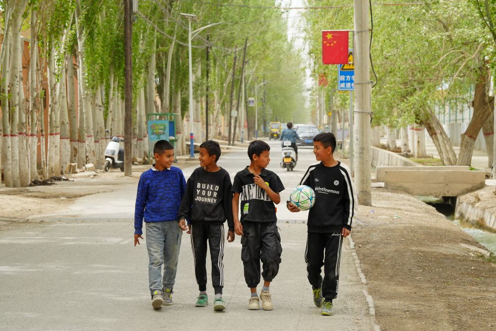 ↑这是在新疆克孜勒苏柯尔克孜自治州阿图什市亚喀巴格村,小朋友们结束踢球后走在村中小路上(4月13日摄)。