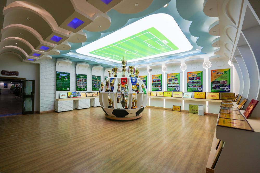 ↑这是新疆克孜勒苏柯尔克孜自治州阿图什一中拍摄的校园足球文化馆内景(4月12日摄)。