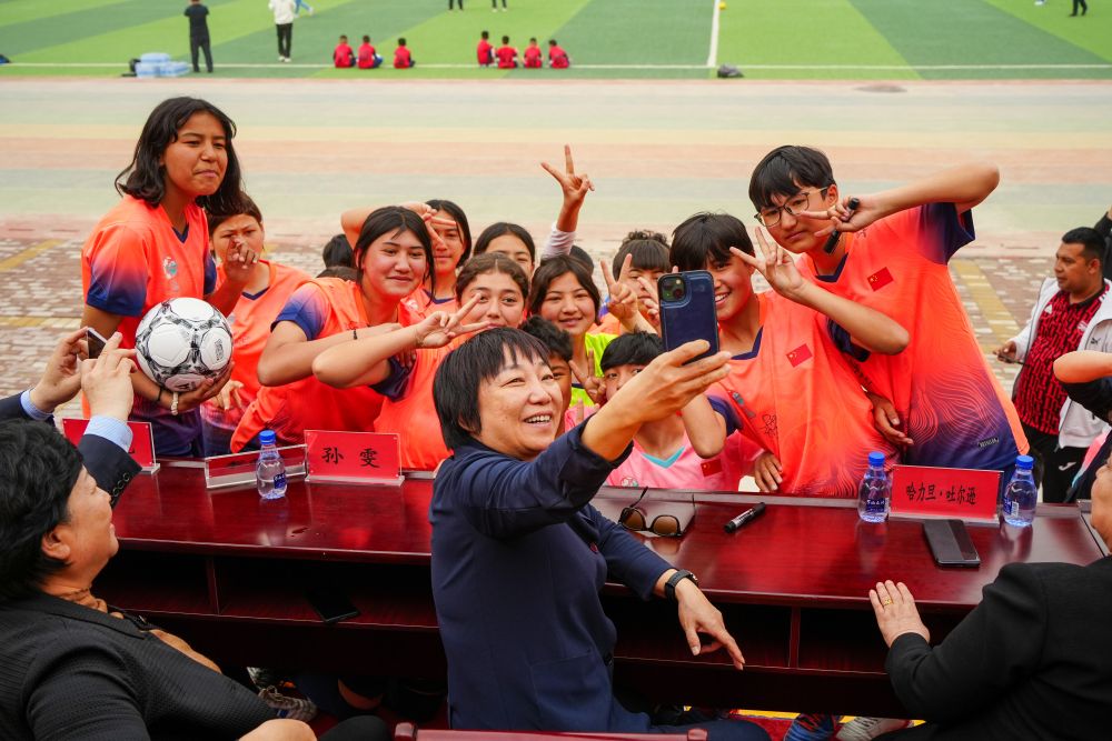 ↑这是在2025新疆克孜勒苏柯尔克孜自治州足球联赛开幕式上,中国足协副主席、前中国国家女子足球队球员孙雯(前中)与阿图什市U13女子足球队合影(4月12日摄)。