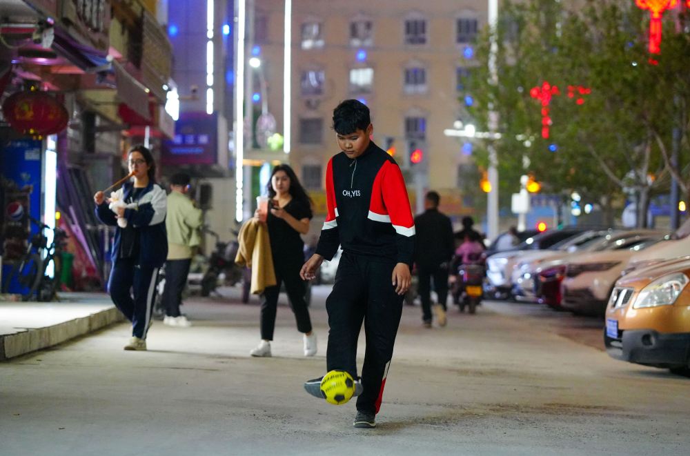 ↑这是在新疆克孜勒苏柯尔克孜自治州阿图什市街头,一名青少年在玩足球(4月13日摄)。