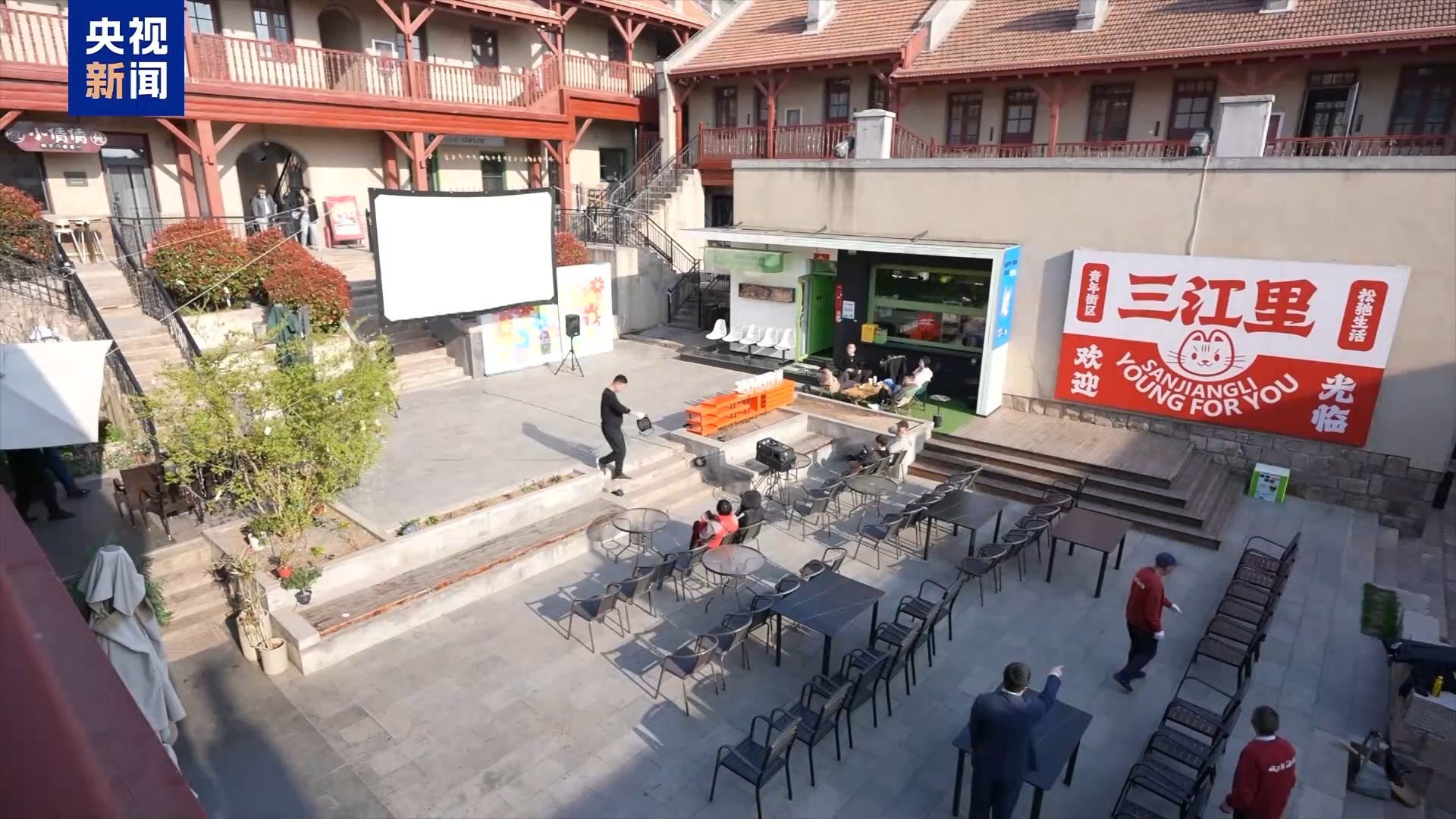 傍晚,两位主播在三江里汇合,在露天的里院,为40多名观众放映了电影。