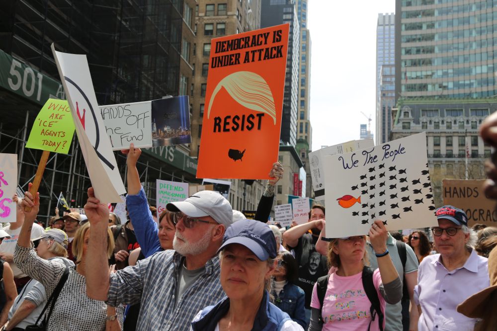 4月19日,人们在美国纽约街头参加抗议活动。美国多地19日举行抗议活动,首都华盛顿、纽约、旧金山、波士顿等城市的民众走上街头,抗议现政府大规模裁员、加征关税、驱逐移民等政策。新华社记者刘亚南摄