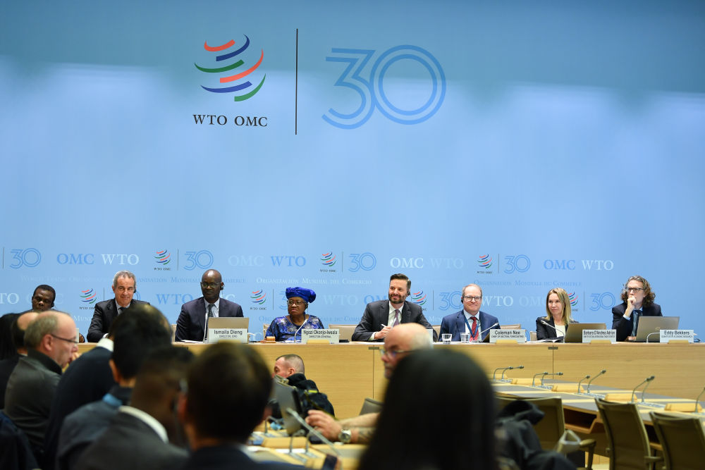 4月16日,在瑞士日内瓦世界贸易组织总部,世贸组织总干事伊维拉(后排左四)出席新闻发布会。世界贸易组织16日发布的最新报告显示,美国关税政策导致全球贸易前景严重恶化。新华社记者连漪摄