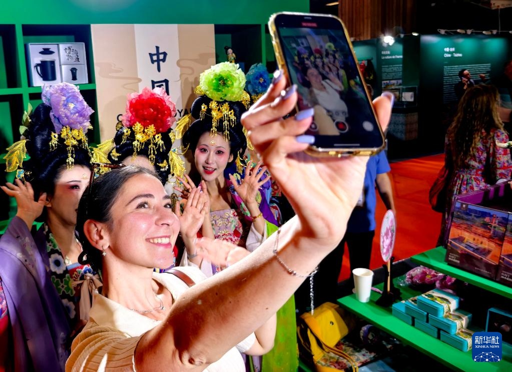 记者在中国展区看到,不少参观者与唐代仕女妆造的中方参展人员合影。法国参观者埃莱娜在中华文化主题展河南展台购买了一件汝窑葫芦造型挂坠,“我喜欢它与众不同的美感”。
