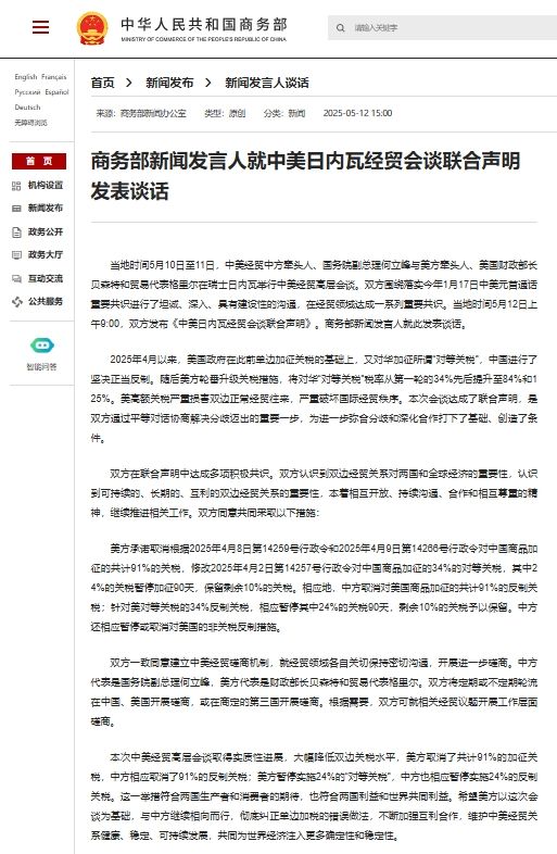 当地时间5月10日至11日,中美经贸中方牵头人、国务院副总理何立峰与美方牵头人、美国财政部长贝森特和贸易代表格里尔在瑞士日内瓦举行中美经贸高层会谈。双方围绕落实今年1月17日中美元首通话重要共识进行了坦诚、深入、具有建设性的沟通,在经贸领域达成一系列重要共识。当地时间5月12日上午9:00,双方发布《中美日内瓦经贸会谈联合声明》。商务部新闻发言人就此发表谈话。