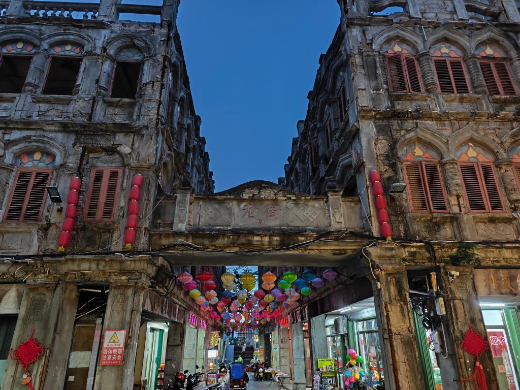 整条老街百米之余,街道两旁一栋栋古老质朴的骑楼建筑,融合了南洋风格、巴洛克风格与中式传统元素。雕刻着精美图案的廊柱、造型各异的女儿墙,尽显南洋建筑的格调;而中式的传统图案和雕刻,又散发着浓浓的本土韵味。