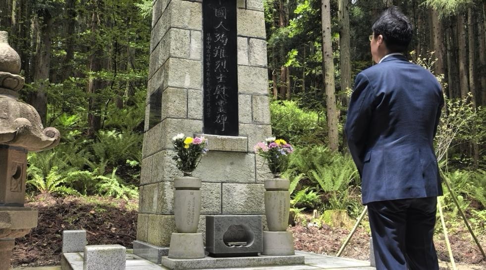 图为中国驻新潟总领事崔为磊在中国殉难劳工慰灵碑前缅怀逝去的中国劳工。(图片由主办方提供)