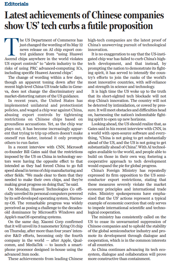 近日,美国商务部网站调整了其5月12日发布的AI芯片出口管制指南新闻稿相关表述,将“在世界任何地方使用华为昇腾芯片均违反美国出口管制法规”调整为“警告业界使用中国先进计算机芯片,包括特定华为昇腾芯片的风险”。