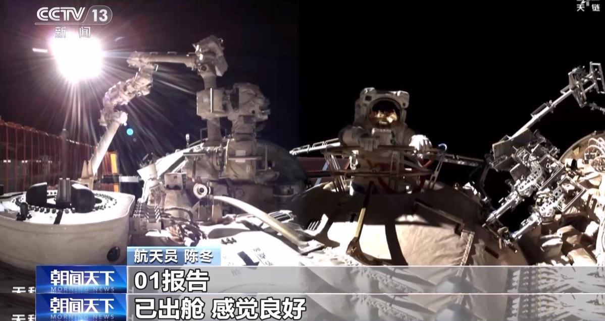 节点舱的出舱口位于空间站背向地球的一侧,开门后首先看到的是浩瀚的太空,出舱后航天员陈冬报告“感觉良好”。