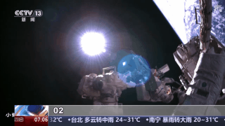 陈冬、陈中瑞、王杰密切协同,在地面科研人员配合支持下,将前期已通过货物气闸舱出舱并利用机械臂转移至中转位置的空间碎片防护装置,安装至预定位置,同时开展了舱外设备设施巡检及处置等任务。