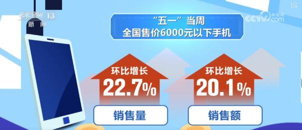 “五一”当周,全国售价6000元以下手机销售量、销售额环比分别增长22.7%、20.1%。20至40岁消费者是主要消费群体,在手机购新中占比62.8%。