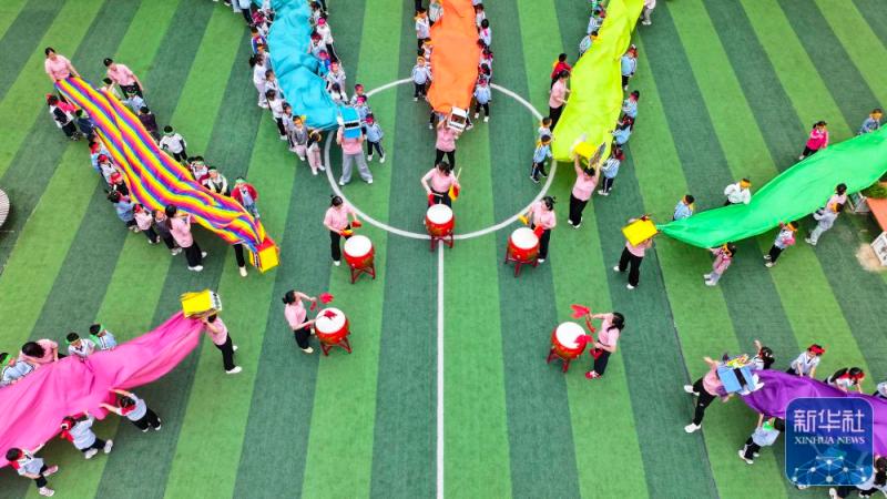 ↑ 5月23日,在山东省东营市广饶县李鹊镇中心幼儿园,小朋友在进行龙舟赛游戏(无人机照片)。新华社发(刘云杰摄)