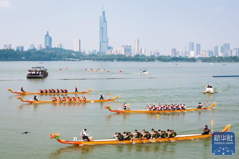 ↑ 5月24日,龙舟队在江苏省南京市莫愁湖公园参加比赛(无人机照片)。新华社发(杨素平摄)