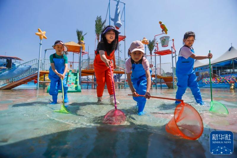 ↑ 5月24日,游客在河北省遵化市南山常乐谷景区水世界参加亲子捞鱼活动。新华社发(刘满仓摄)