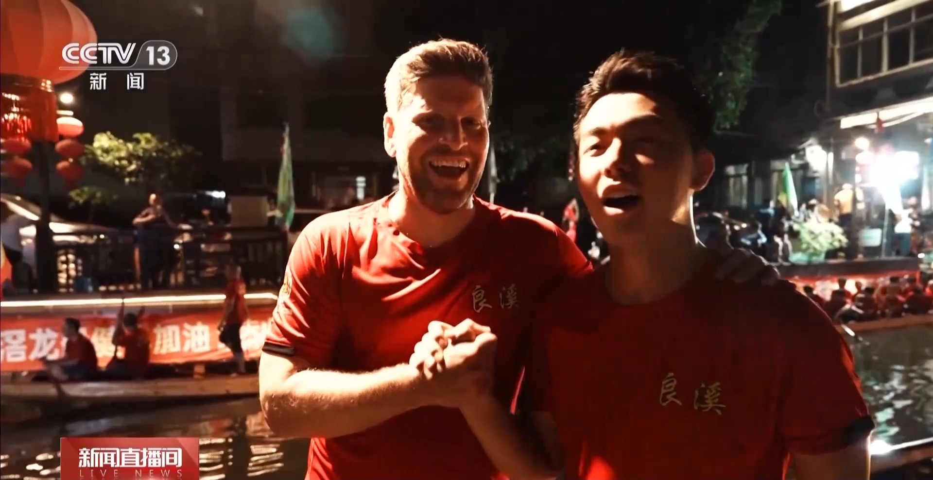 晚上8点,当记者来到佛山南海区的叠北社区时,河道两边已经围满了观看夜训的村民和游客。伴随着铿锵鼓点和阵阵欢呼,队员们挥臂划桨、破水前行,一艘艘龙舟在河道中穿梭、漂移、折返。在激烈的竞技中,一个金发碧眼的外国面孔正和中国“扒仔”们一起奋力划行。
