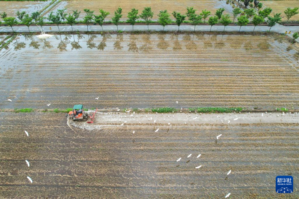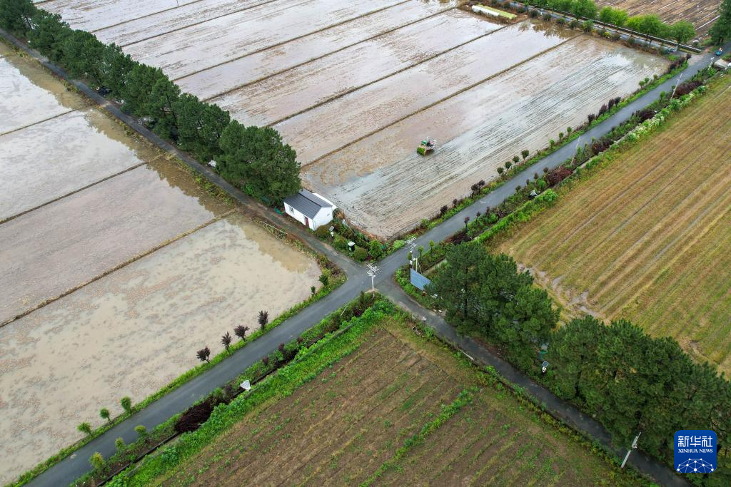 6月2日,浙江省湖州市德清县乾元镇村民驾驶犁田机械翻耕农田,为栽插晚稻秧苗做准备(无人机照片)。