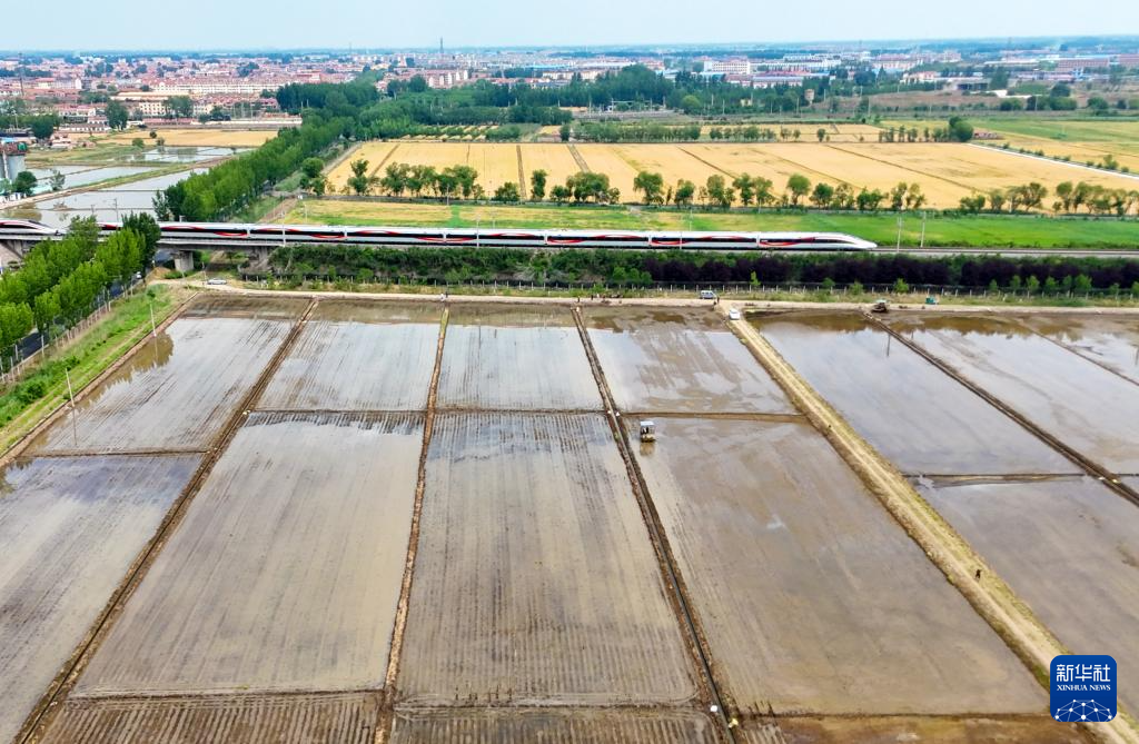 6月2日,列车从山东省青岛市即墨区蓝村街道青香水稻种植合作社的稻田旁驶过(无人机照片)。