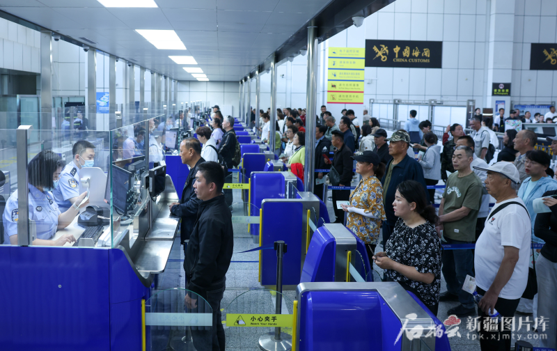 6月3日,中哈霍尔果斯国际边境合作中心联检大厅内,游客有序排队等待办理入园手续。陈助邦摄