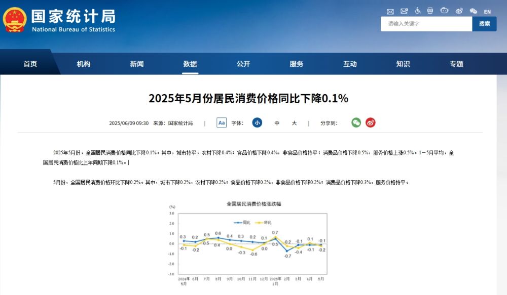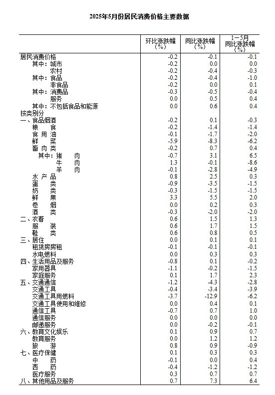 2025年5月份,全国居民消费价格同比下降0.1%。其中,城市持平,农村下降0.4%;食品价格下降0.4%,非食品价格持平;消费品价格下降0.5%,服务价格上涨0.5%。1—5月平均,全国居民消费价格比上年同期下降0.1%。