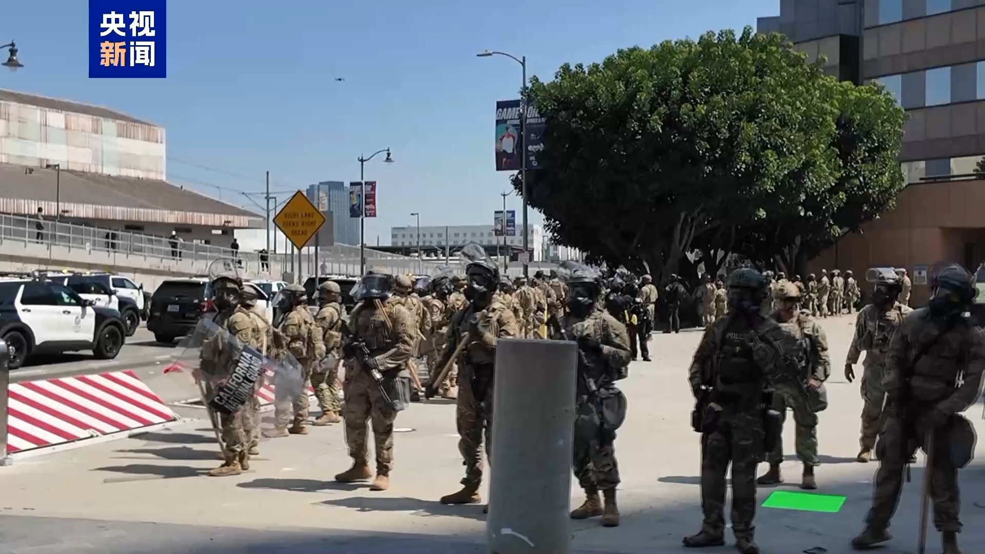 央视记者 刘骁骞:同时,美国国民警卫队已部署在现场。这些荷枪实弹穿着迷彩服的士兵就是特朗普政府部署的国民警卫队队员,他们在几个小时前,也就是当地时间8日上午入驻到这里。根据官方消息,目前已经有至少300名国民警卫队队员抵达洛杉矶。