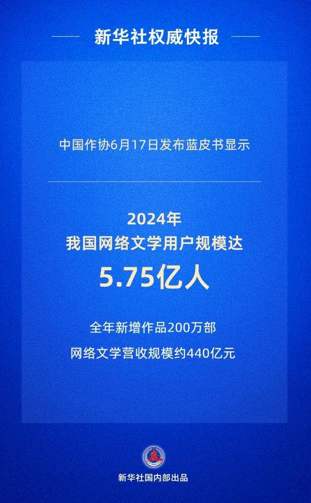 中国作家协会6月17日发布的《2024中国网络文学蓝皮书》显示,我国网络文学用户规模达5.75亿人。核心阅读群体为26至45岁读者,约占全部读者的50%;“00后”读者占比近25%。